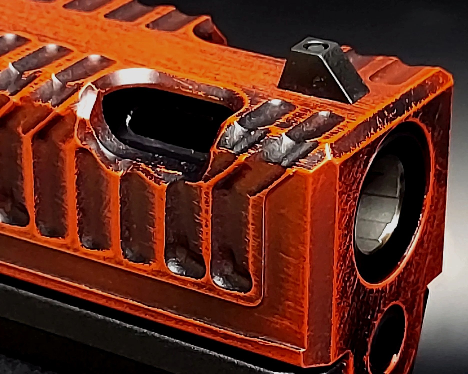 Matched porting on both barrel and slide to split gas around the sight line.