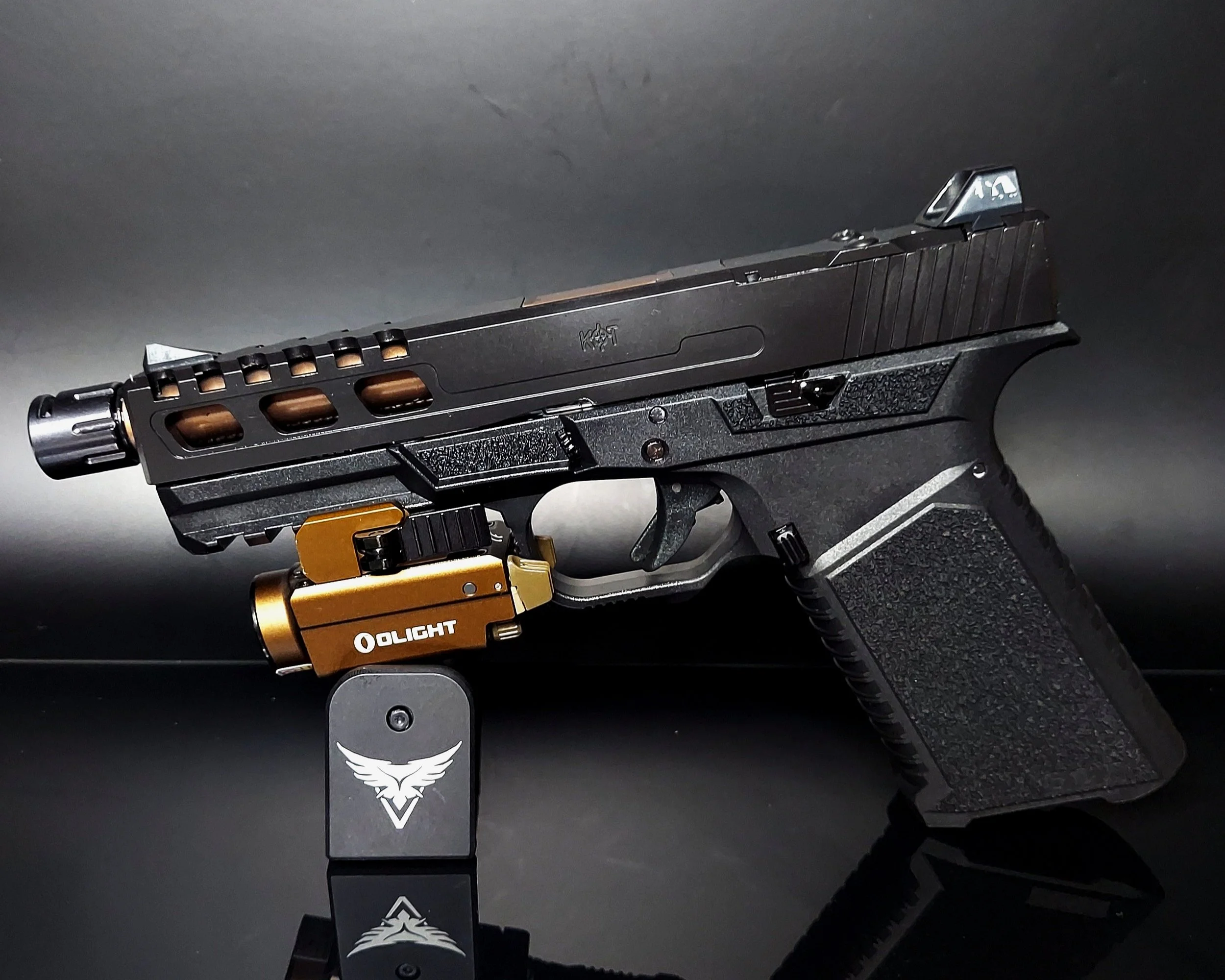 Image 1 of 4 Image 2 of 4 Image 3 of 4 Image 4 of 4 "REVERENT" $600.00 Full-Size Pistol Add to Cart Added! Full-Size Pistol REVERENT is pictured with an optional weapon light/laser (+$125) and micro compensator (+$50).